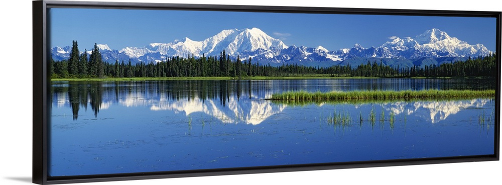 <p>Panoramic photograph on a big canvas of snow covered Mt Foraker and Mt McKinley behind a line of trees, reflecting in blue water in the Denali National Park, in Alaska.</p>