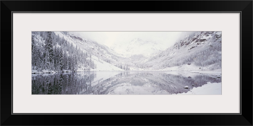 <p>Large panoramic photograph of a lake with the reflection of the snow covered trees and mountain in the water.</p>