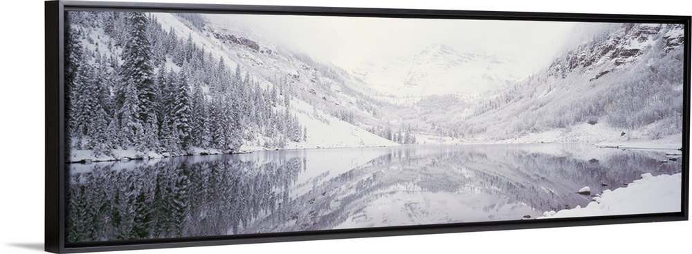 <p>Large panoramic photograph of a lake with the reflection of the snow covered trees and mountain in the water.</p>