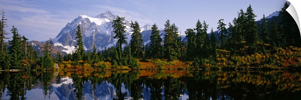 <p>Pine trees and a snow covered mountain reflect perfectly into the lake that sits in front of them.</p>