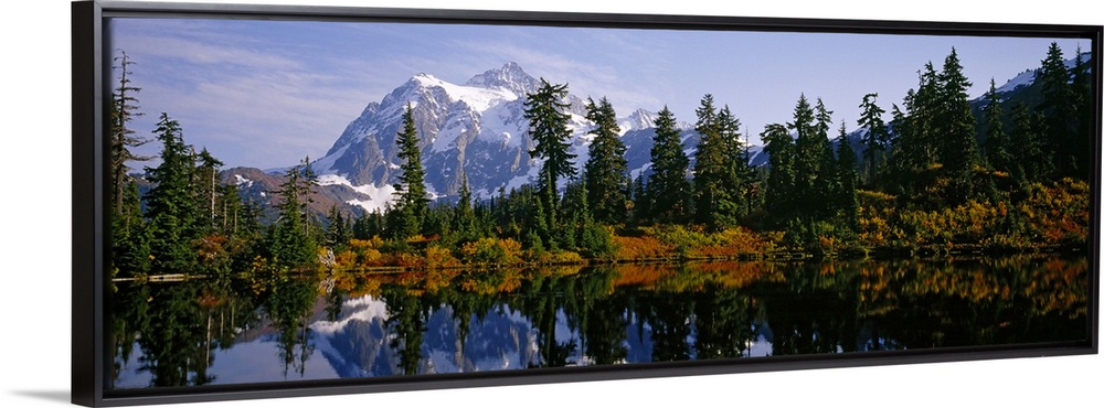 <p>Pine trees and a snow covered mountain reflect perfectly into the lake that sits in front of them.</p>