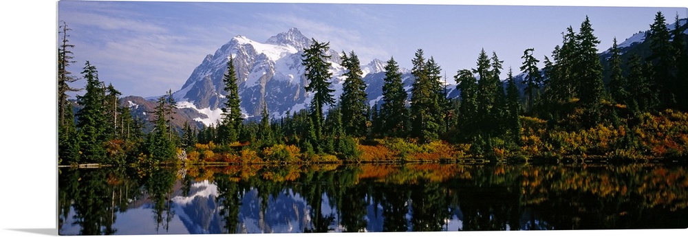 <p>Pine trees and a snow covered mountain reflect perfectly into the lake that sits in front of them.</p>