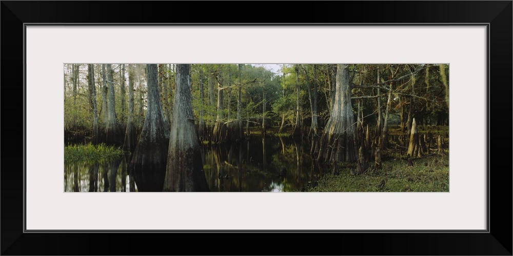 <p>Large panoramic piece of a dense forest with it's trees growing out of swamp water and their reflections shown in it.</p>