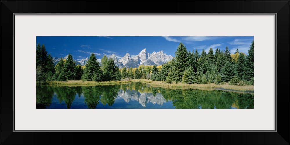 <p>Panoramic photo print of a water with a reflection of the rugged mountains and forest in the distance.</p>
