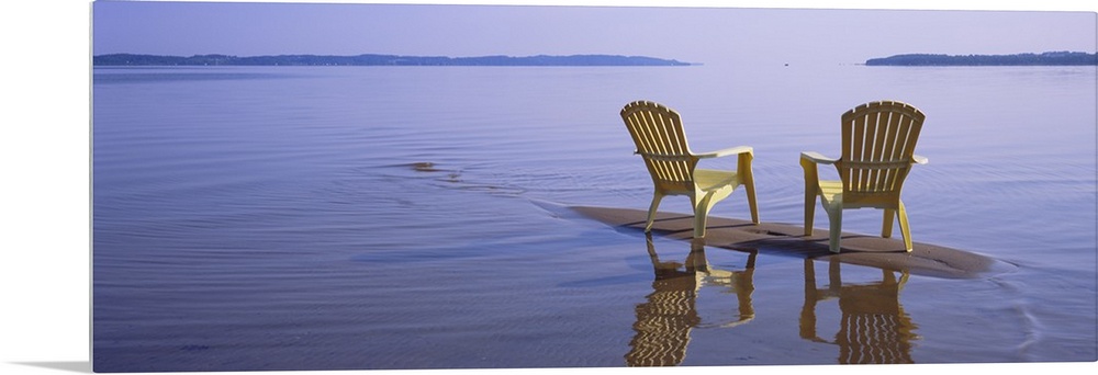 <p>Panoramic photograph of two beach chairs sitting on top of sand bar with land in the far distance.</p>