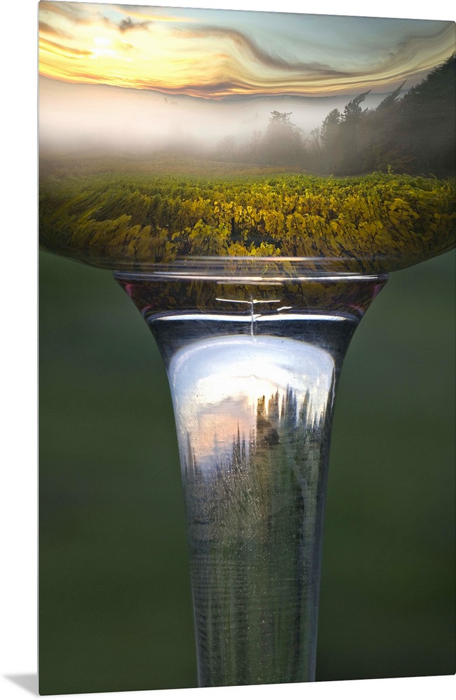 <p>Reflection of vineyard landscape in Riedel Oregon Pinot Noir wine glass with wine.</p>