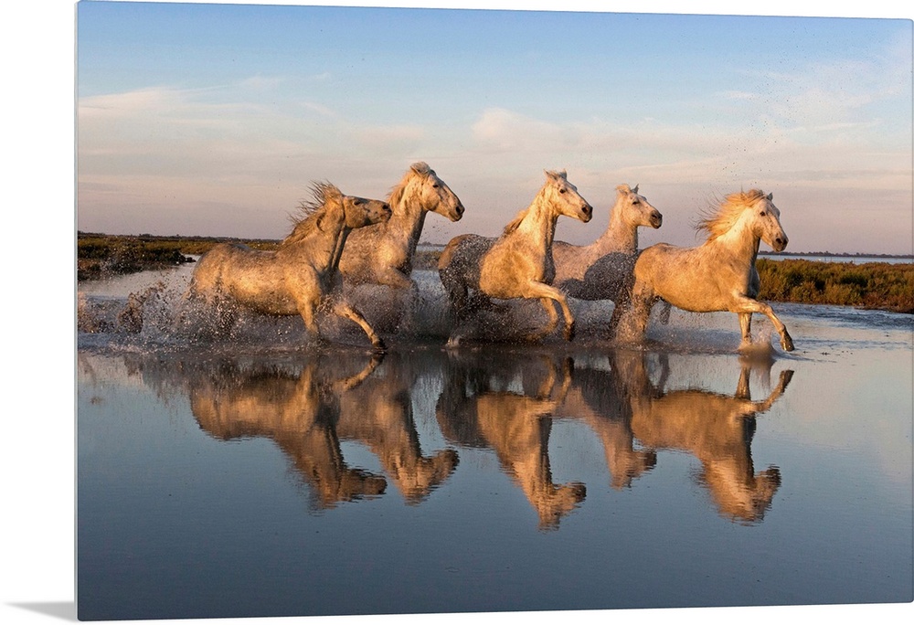 <p>Reflection of white horses of the Camargue running through a shallow lake, Camargue, Provence Alpes Cote d'Azur, France</p>