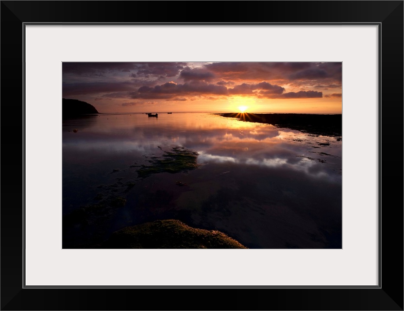 <p>A Beautiful warm golden sunrise over reflecting wet sand with dramatic clouds.</p>