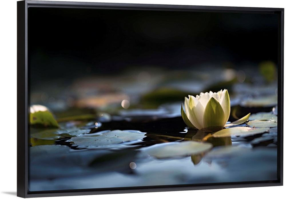 <p>Fine art photo of a water lily floating in a pond among lily pads.</p>