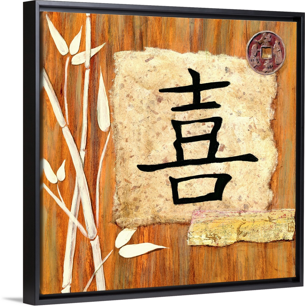 <p>Home decor artwork of an Asian character meaning happiness against a wood-like background with white bamboo stalks.</p>