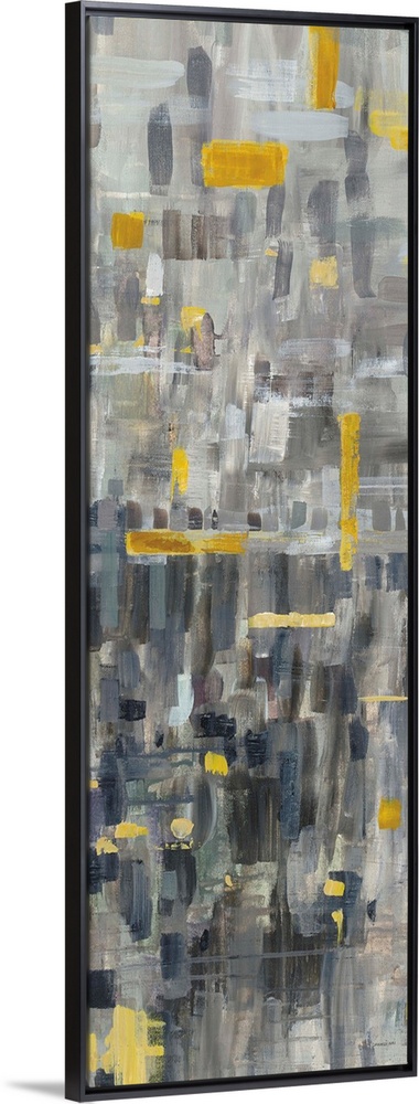 <p>Tall, rectangular abstract painting with neutral toned brushstrokes in the background and bright gold brushstrokes on top.</p>