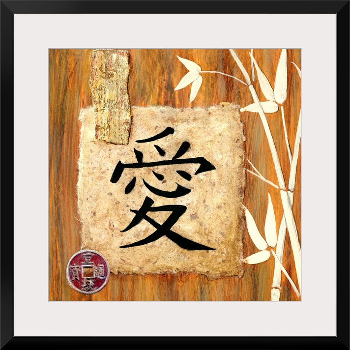 <p>Home decor artwork of an Asian character meaning love against a wood-like background with white bamboo stalks.</p>