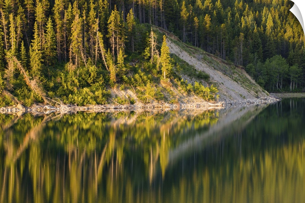<p>Pine Trees reflect onto the still surface of Lake Sherburne in the Many Glacier Area of Glacier National park on a calm morning</p>