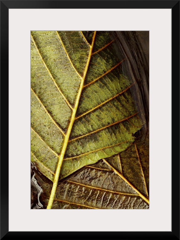 <p>Two large leafs are photographed very closely on the surface of water.</p>