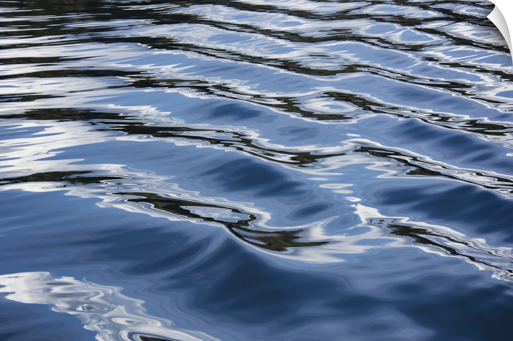 <p>The blue, black, and white reflections of the sky, clouds, and nearby land on the wake of a boat in the Puget sound, Washington, creating a lovely texture and sense of movement, puget sound, Washington, united states of America.</p>