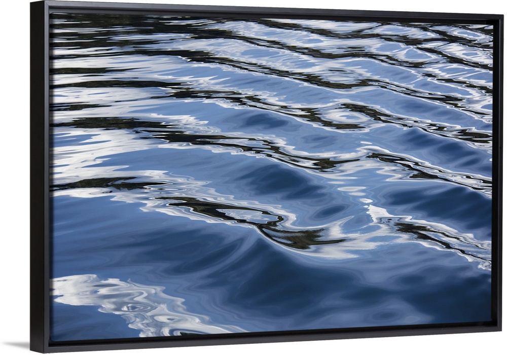 <p>The blue, black, and white reflections of the sky, clouds, and nearby land on the wake of a boat in the Puget sound, Washington, creating a lovely texture and sense of movement, puget sound, Washington, united states of America.</p>