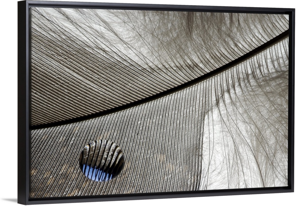 <p>A feather is photographed closely in black and white to show detail.</p>