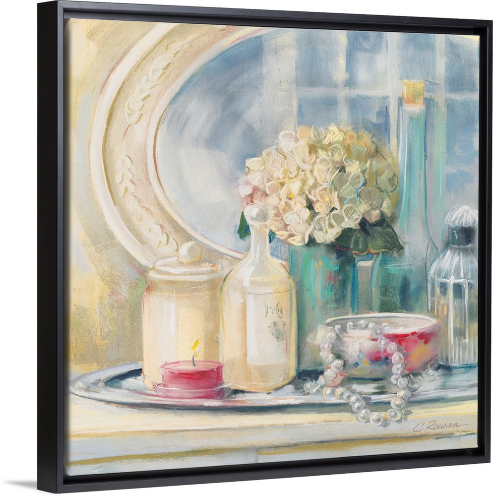 <p>Painting of a bouquet in a jar and several containers of cosmetics on a vanity.</p>