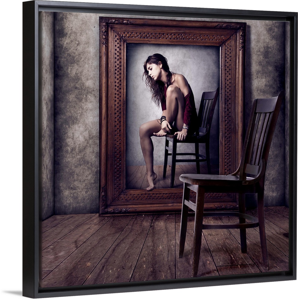 <p>Conceptual image of a woman sitting on a chair in a large picture frame, with an empty chair in the foreground.</p>
