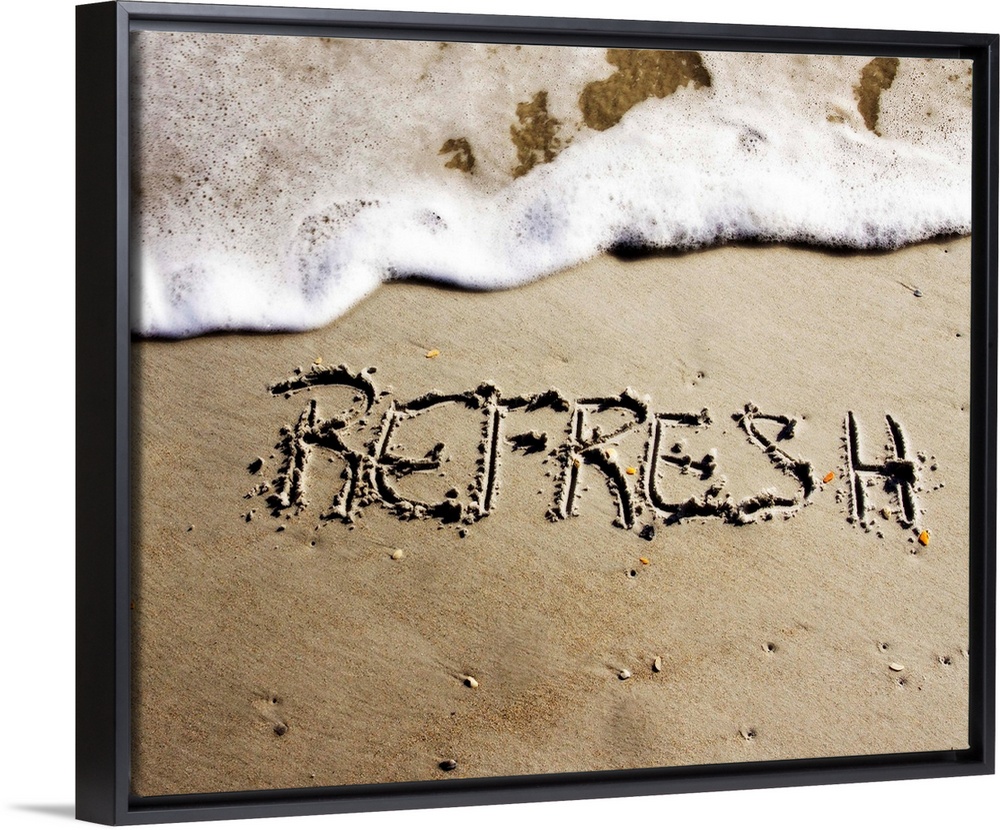 <p>The word "Refresh" drawn in the sand near the ocean water.</p>