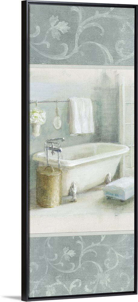 <p>A long vertical decorative composition of a white bathroom scene bordered with slate blue floral design.</p>