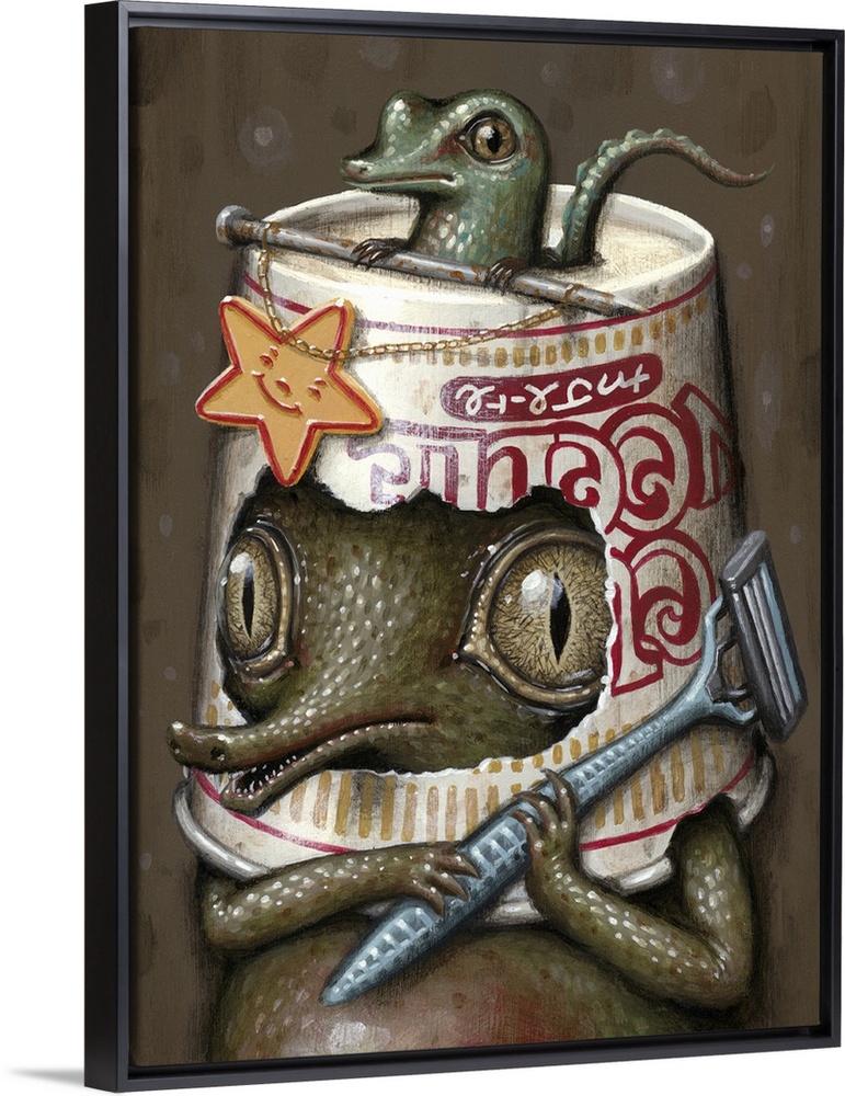 <p>Surrealist painting of an alligator wearing a cup-o-noodles container for a hat and holding a disposable razor, with a little alligator sticking out the top of the container.</p>