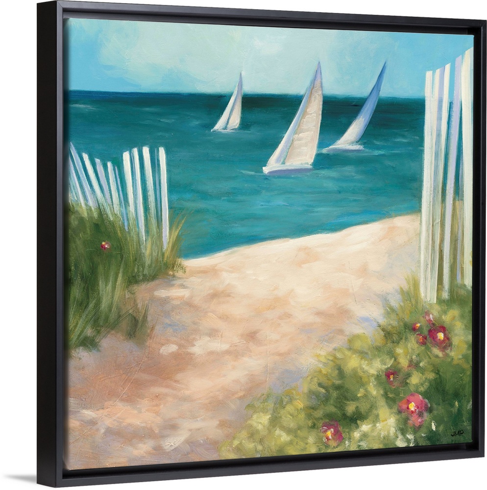 <p>Contemporary painting of a sandy path on the beach with three sailboats in the ocean.</p>