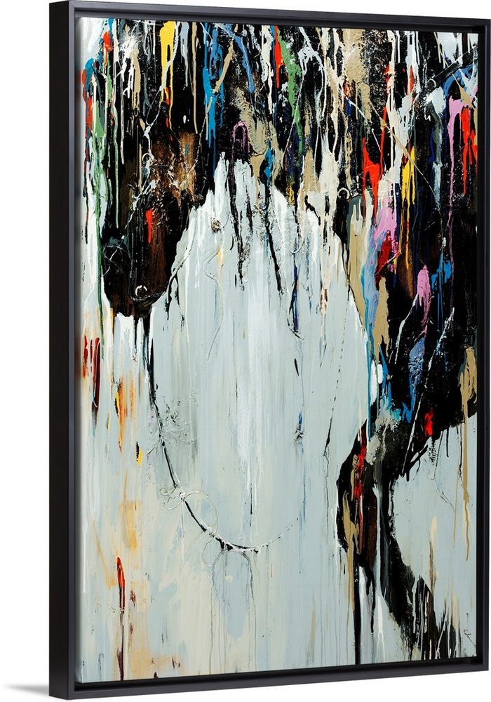 <p>Contemporary abstract painting with drips and splashes of color over top a depiction of a wild animal.</p>
