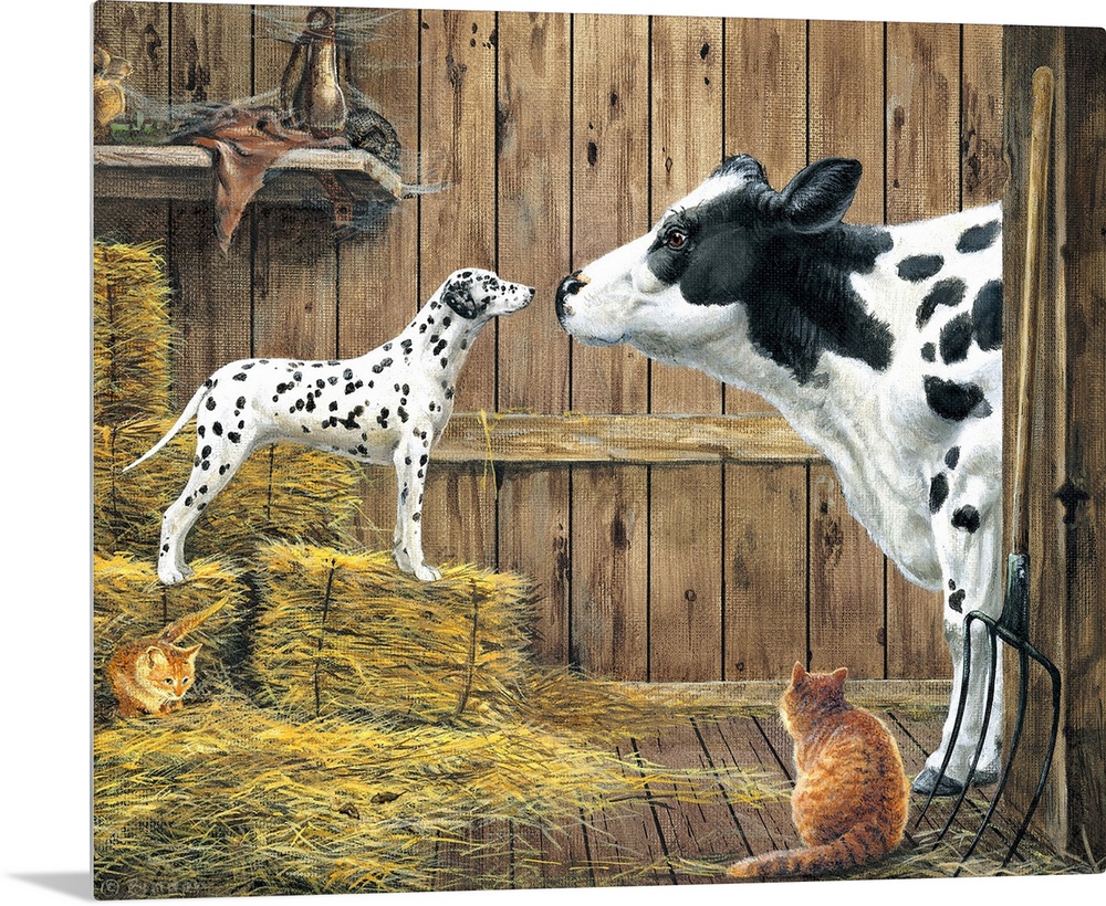 <p>Contemporary painting of a cow and dalmatian standing nose to nose staring at each other.</p>