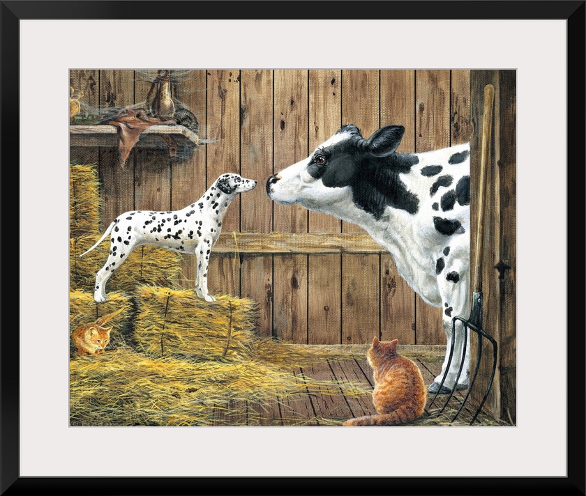 <p>Contemporary painting of a cow and dalmatian standing nose to nose staring at each other.</p>