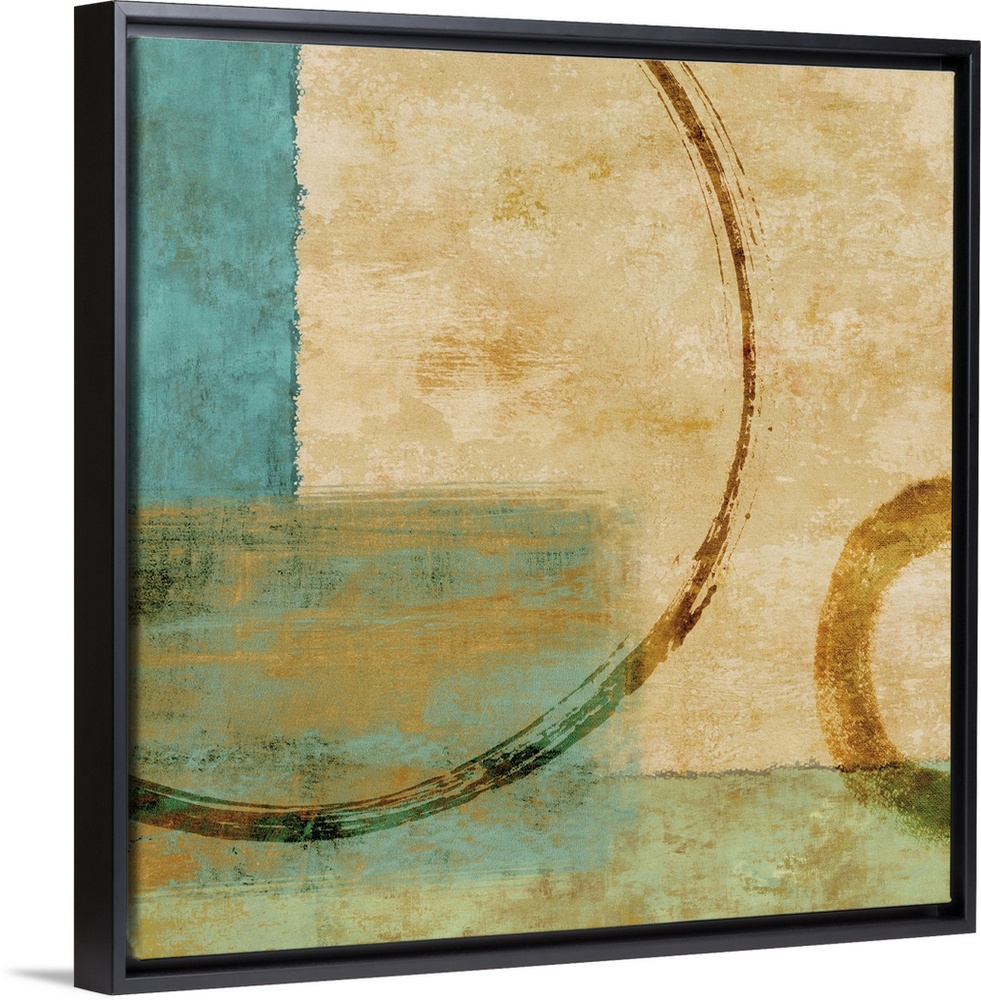 <p>Square abstract in cream, gold, tan, green, and blue hues with circular and rectangular shapes.</p>