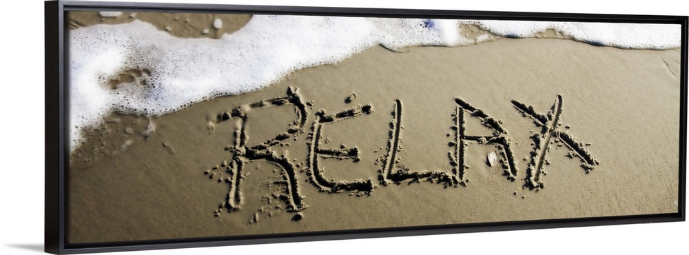 <p>The word "Relax" drawn in the wet sand near ocean water.</p>