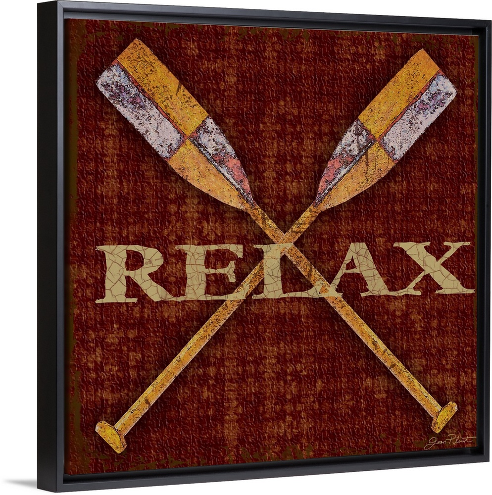 <p>Home decor artwork of crossed rowboat oars against a dark red background with the word Relax in gold lettering.</p>