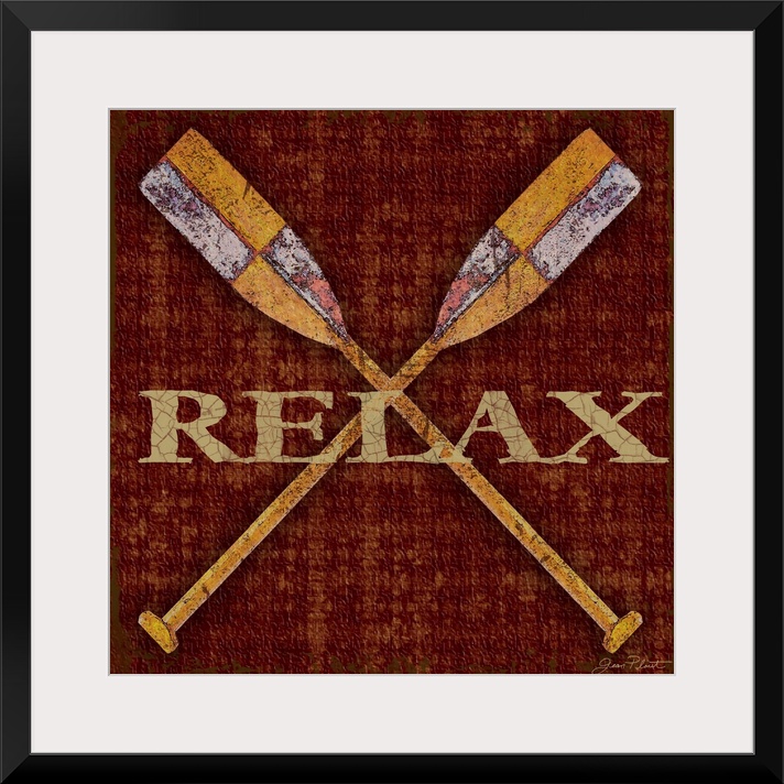 <p>Home decor artwork of crossed rowboat oars against a dark red background with the word Relax in gold lettering.</p>