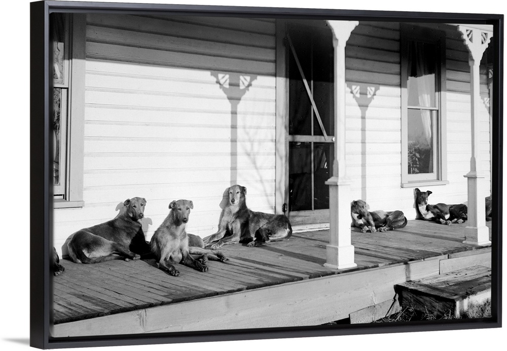 <p>A group of seven mixed breed dogs take over a wooden porch to relax in the sunshine.</p>