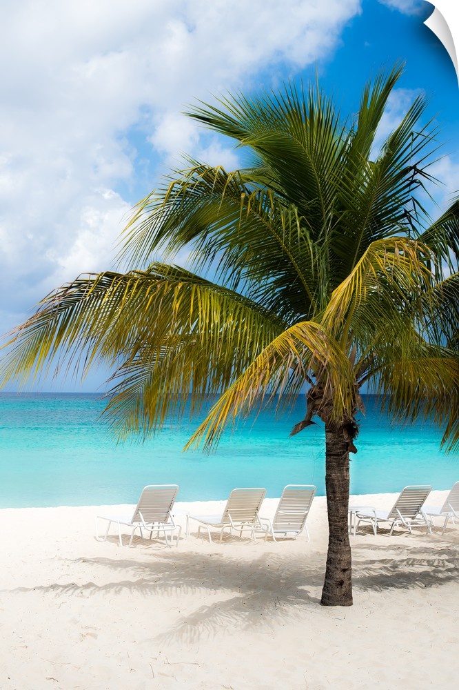 <p>A beautiful photograph of the calm, clear, blue beach with white sands and a palm tree.</p>