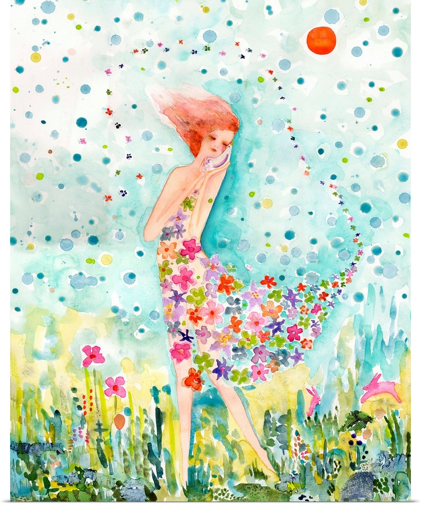 <p>A woman in a dress made of flowers trailing into the air.</p>