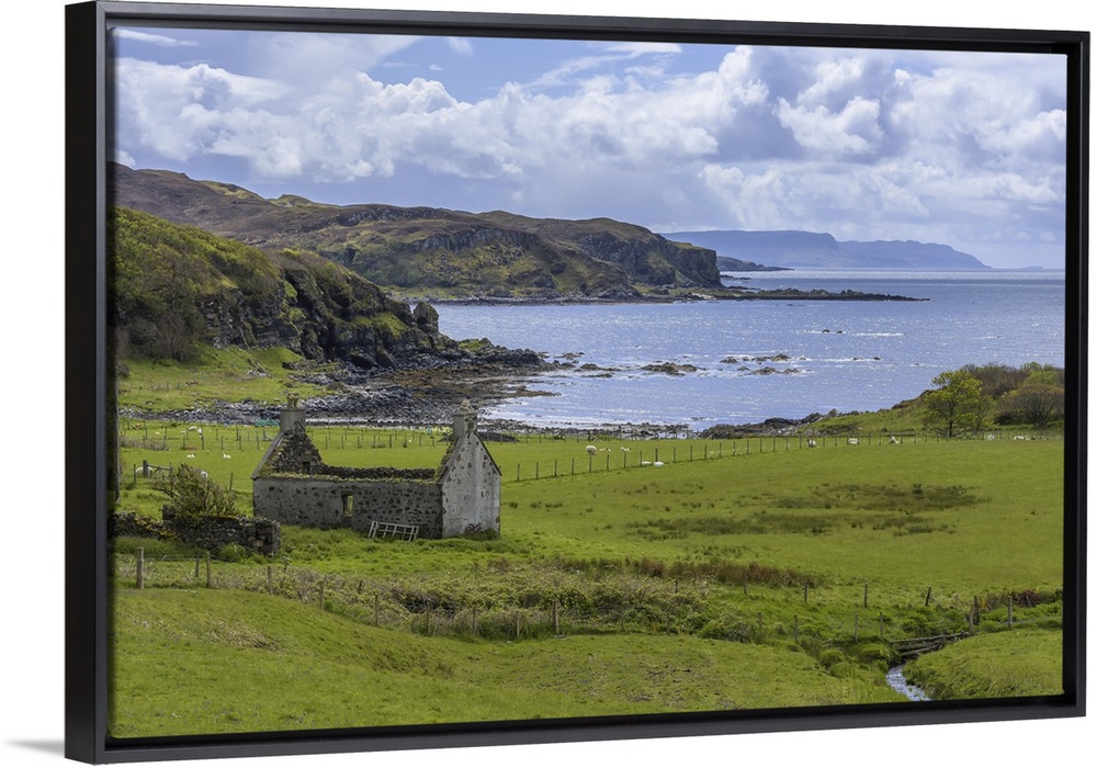 <p>Remains of a stone house in grassy field along the coast on the Isle of Skye in Scotland, United Kingdom</p>