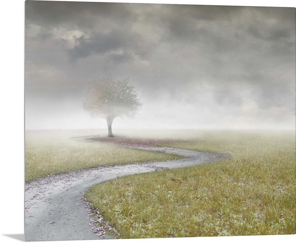 <p>Beautiful landscape with an isolated tree and a path with clouds and fog.</p>