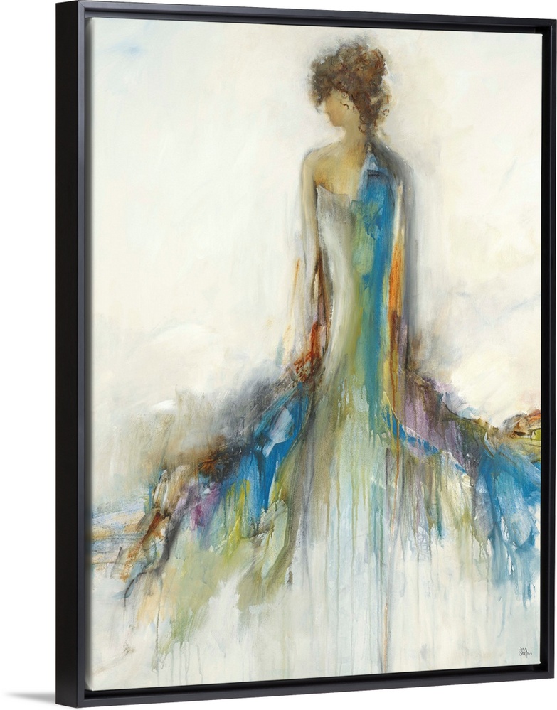 <p>Abstract portrait of the back of a woman with a long, colorful, flowing dress with the hues dripping to the bottom of the canvas.</p>