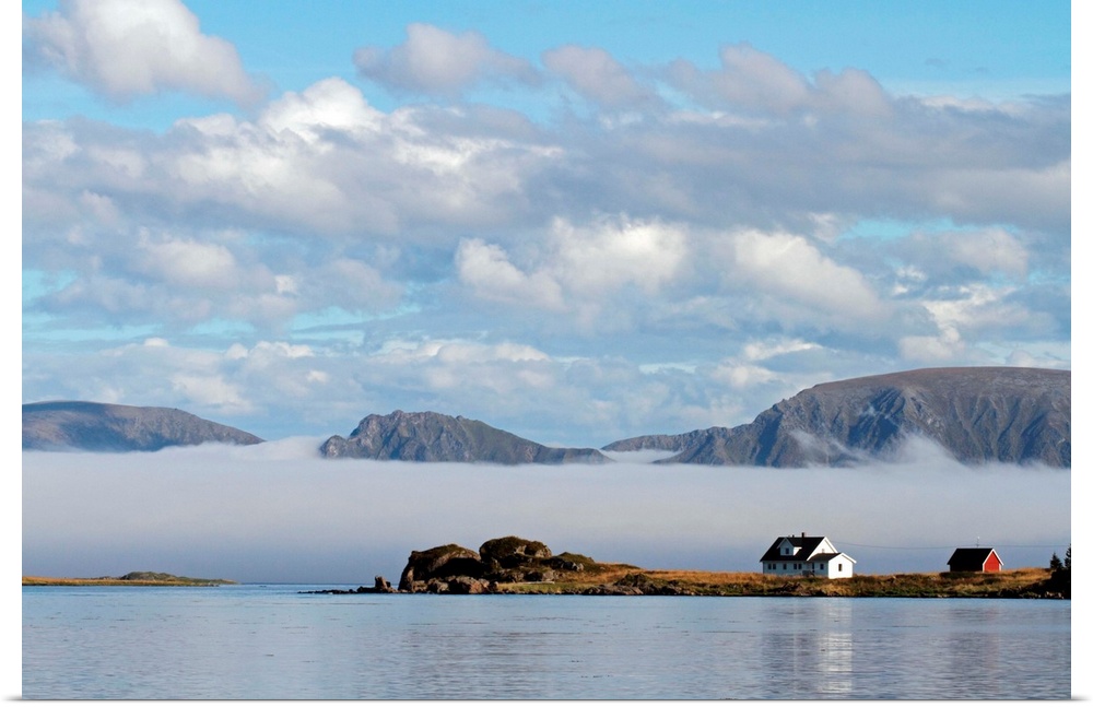 <p>Remote house on the island of Langoya in the Vesteralen Islands, Norway, with sea fog and mountains on Andoya in the background.</p>