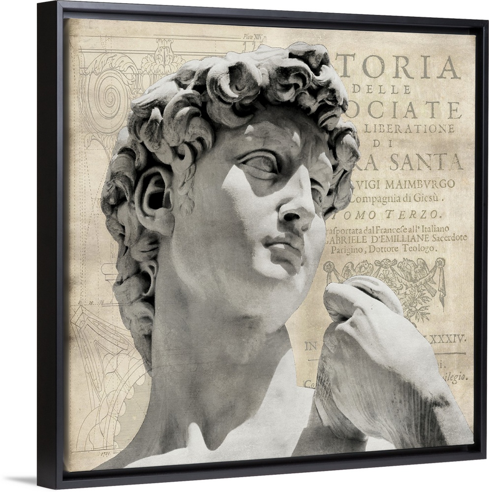 <p>Square renaissance themed decor with the top of the statue of David in the foreground and text in the background.</p>
