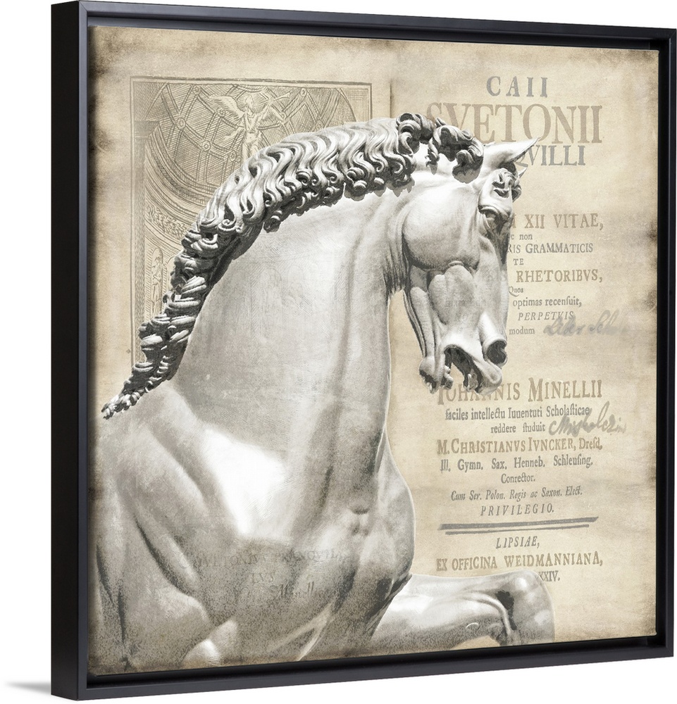 <p>Square renaissance themed decor with Leonardo's Horse in Milan sculpture in the foreground and text in the background.</p>