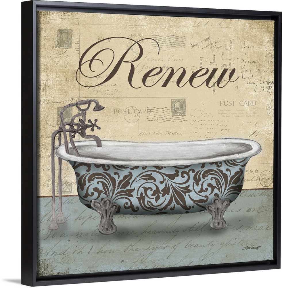 <p>Powder blue, tan, and brown bath decor with a painting of a claw foot bathtub decorated in paisley designs and "Renew" written at the top with faint post card stamps and writing in the background.</p>