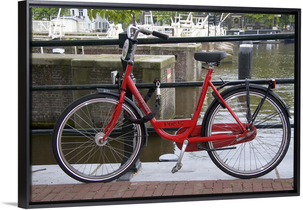 <p>Rental bicycle parked along the Amstel River in Amsterdam, Netherlands.</p>