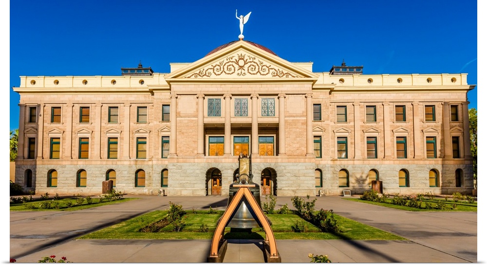 <p>Replica of liberty bell in front of arizona state capitol building at sunrise, phoenix, arizona.</p>