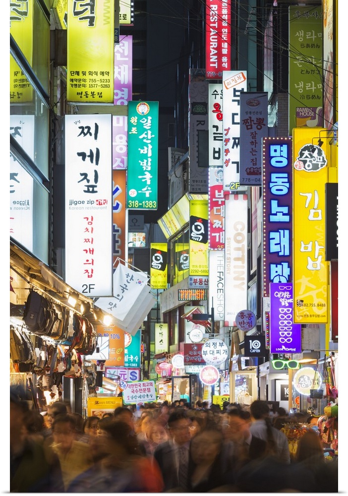 <p>Asia, Republic of Korea, South Korea, Seoul, neon lit streets of Myeong-dong.</p>