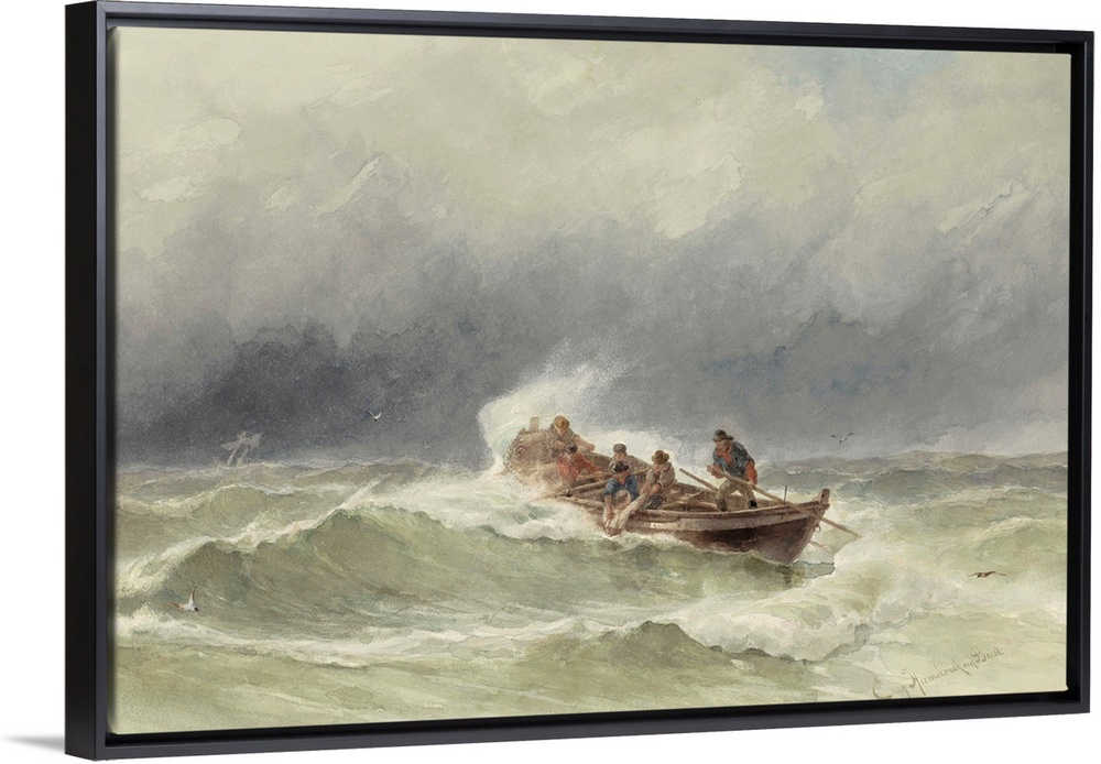 <p>Rescue at Sea, by Jacob Eduard van Heemskerck van Beest, c. 1850-90, Dutch watercolor painting. Six man rowboat pulls a seaman abroad in storm blown open sea.</p>
