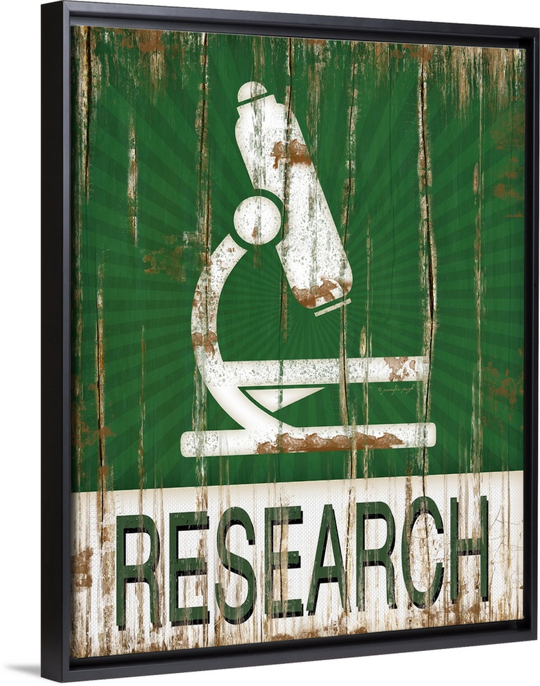 <p>This distressed decor features a microscope with the word, "Research" underneath.</p>