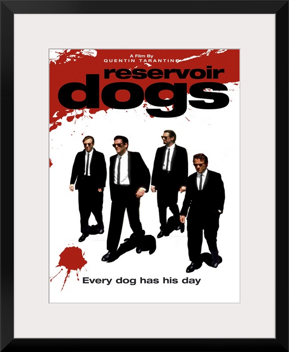 <p>Movie poster for "Reservoir Dogs". It has the four main characters walking in suits with splashes of red on the top and bottom of the poster.</p>